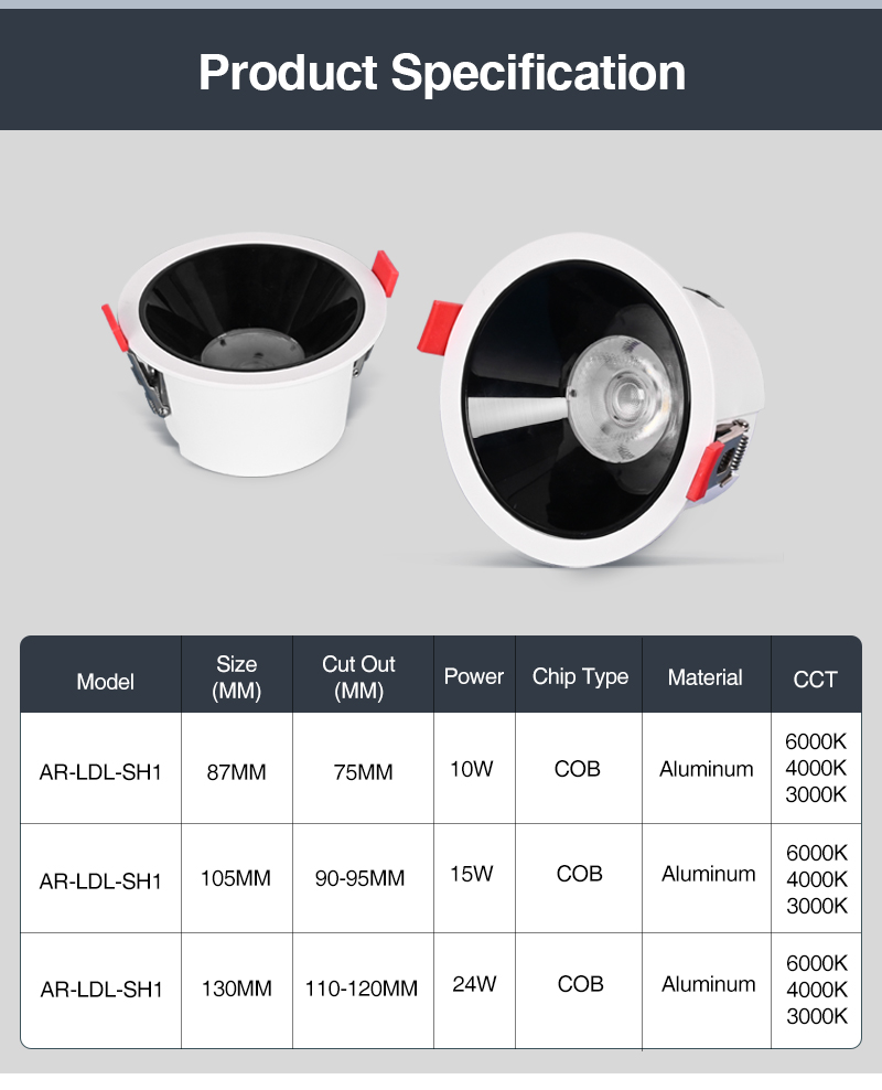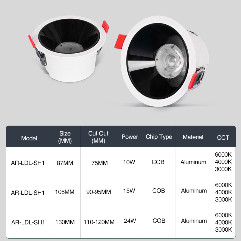 AR-LDL-SH1-15W 15W 105MM 90-95MM COB 6K/4K/3K >80LM/W Aluminum