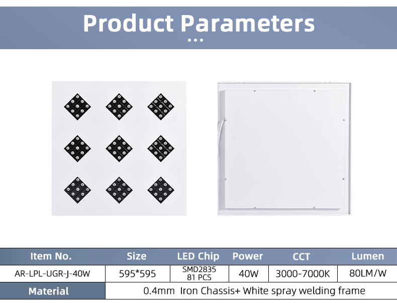 | AR-LPL-UGR-J | 595*595 | 40W | 2835 81pcs 9V 1.5W 130-140LM/1pcs |