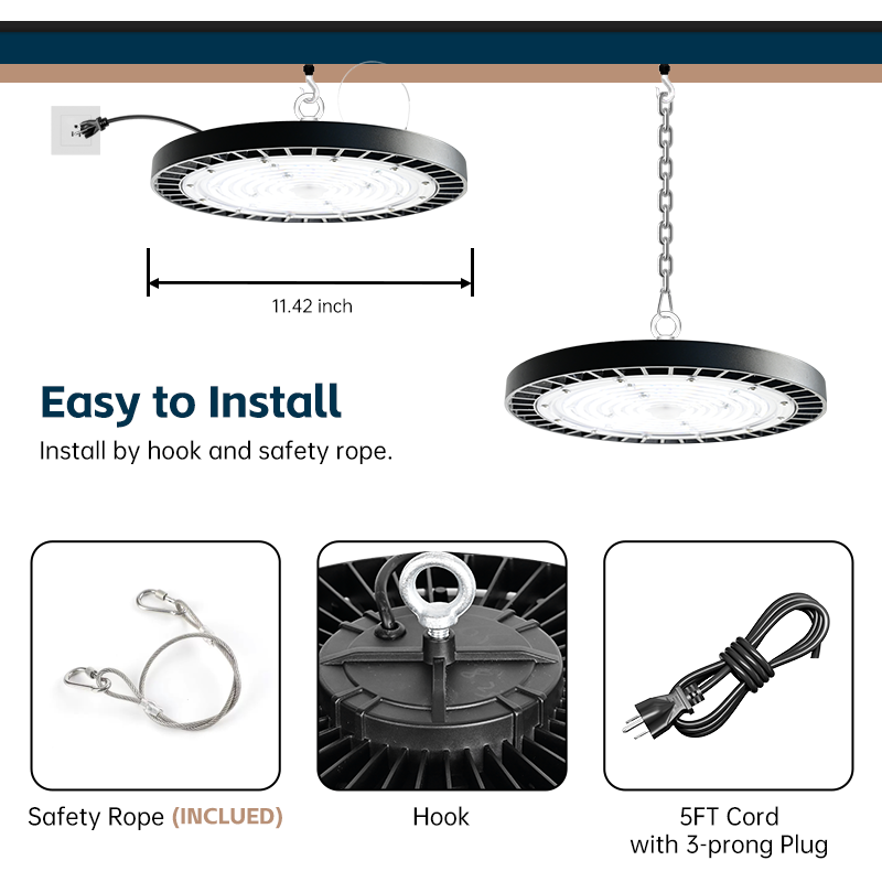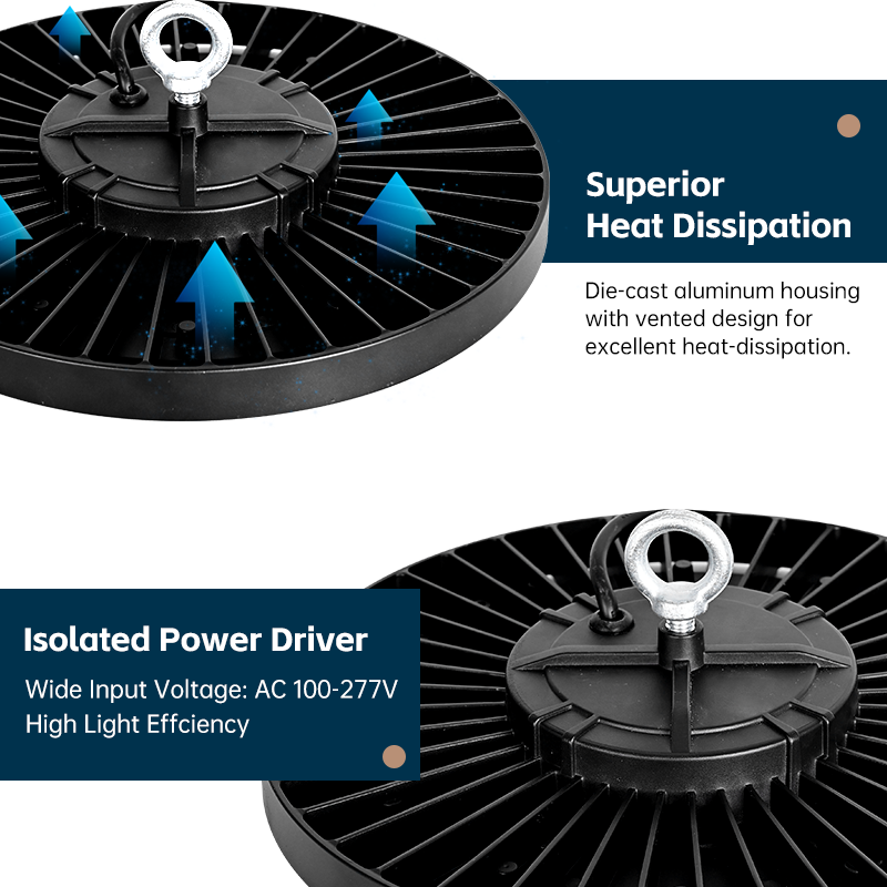 New private mold design, integrated ultra thin Independent power driver,Industrial LED High Bay Lights deliver ultra-bright, energy-efficient illumination for demanding workspaces like factories, warehouses, and workshops. Engineered to ISO9001, TUV, ETL, DLC, CE-LVD-EMC, RoHs standards, they slash electricity costs by up to 80% while ensuring premium durability. Featuring robust IP65-rated protection and die-cast aluminum housing for superior heat dissipation, these lights thrive in harsh industrial environments.