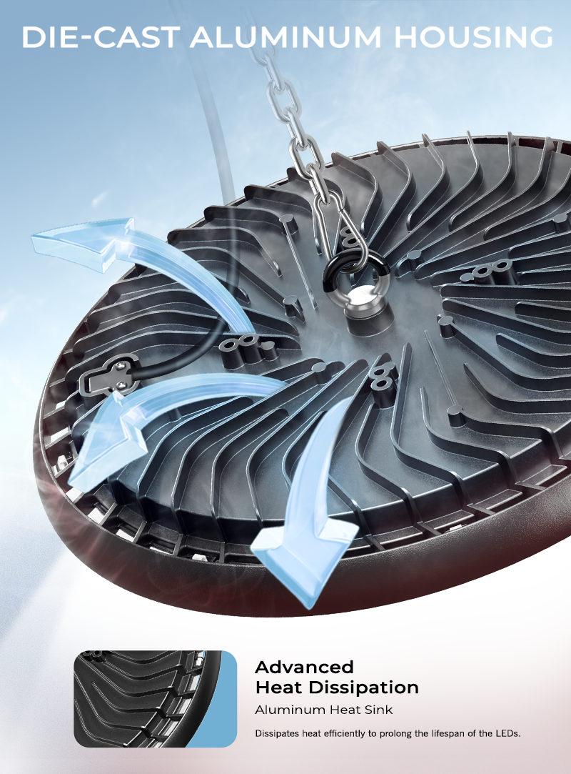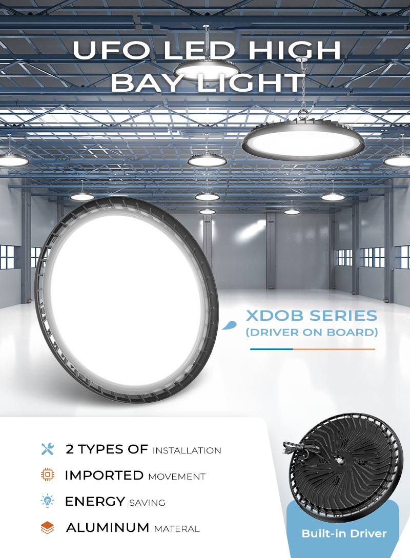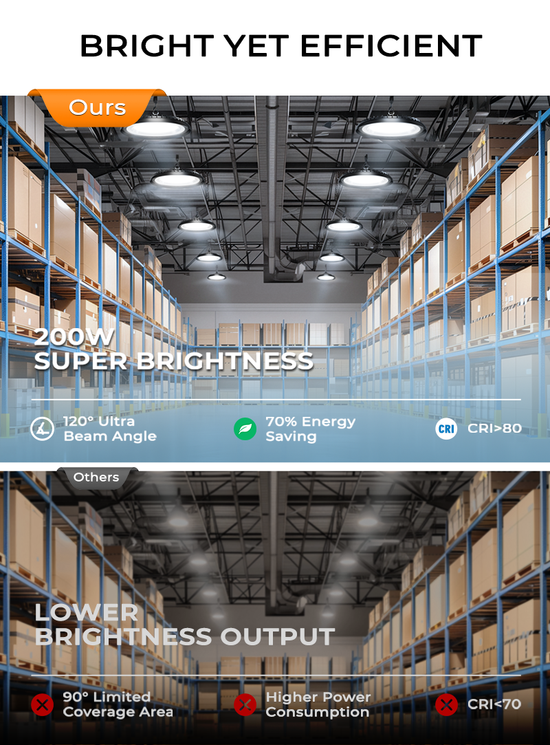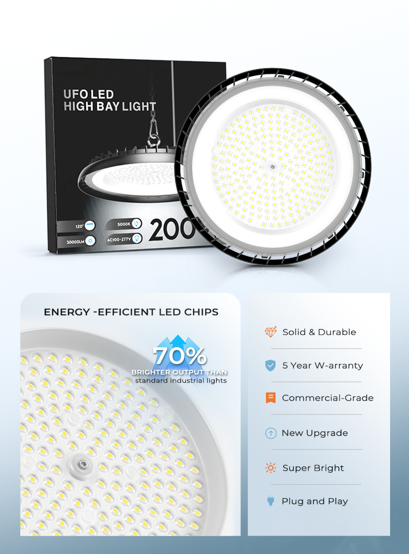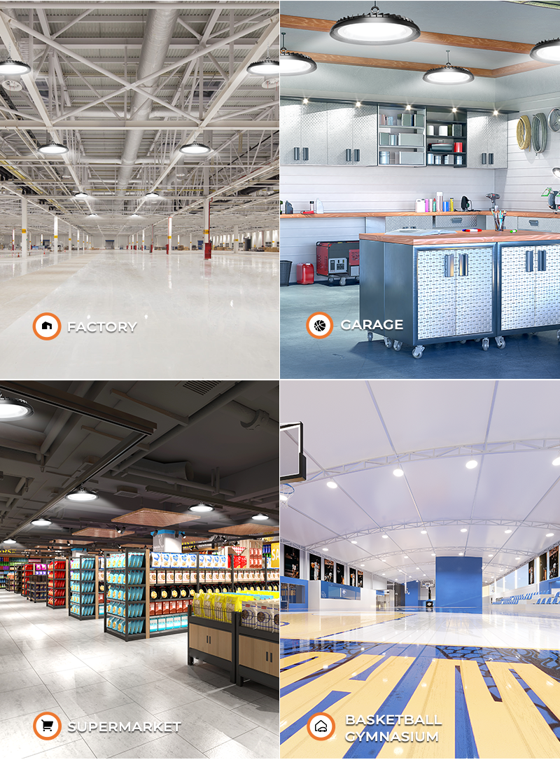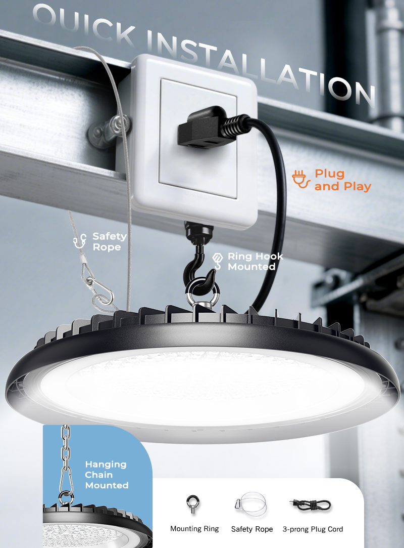 Industrial LED High Bay Lights deliver powerful, energy-efficient illumination for demanding workspaces, significantly slashing electricity costs. Engineered with robust IP65-rated protection and die-cast aluminum housing for superior heat dissipation, they ensure reliable operation in harsh industrial environments. Featuring multiple installation methods and optional pre-wired cables (0.3-3M), these high-quality lights offer effortless setup and maintenance-free performance—ideal for factories, warehouses, and workshops requiring bright, durable lighting.
