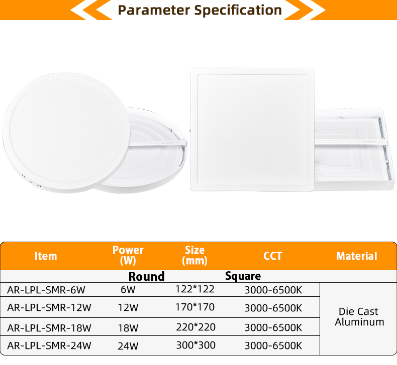 AR-LPL-SMS-12W-N 160*160*H24 N/A 12 60 600 3000-6500K 40 39 36 37