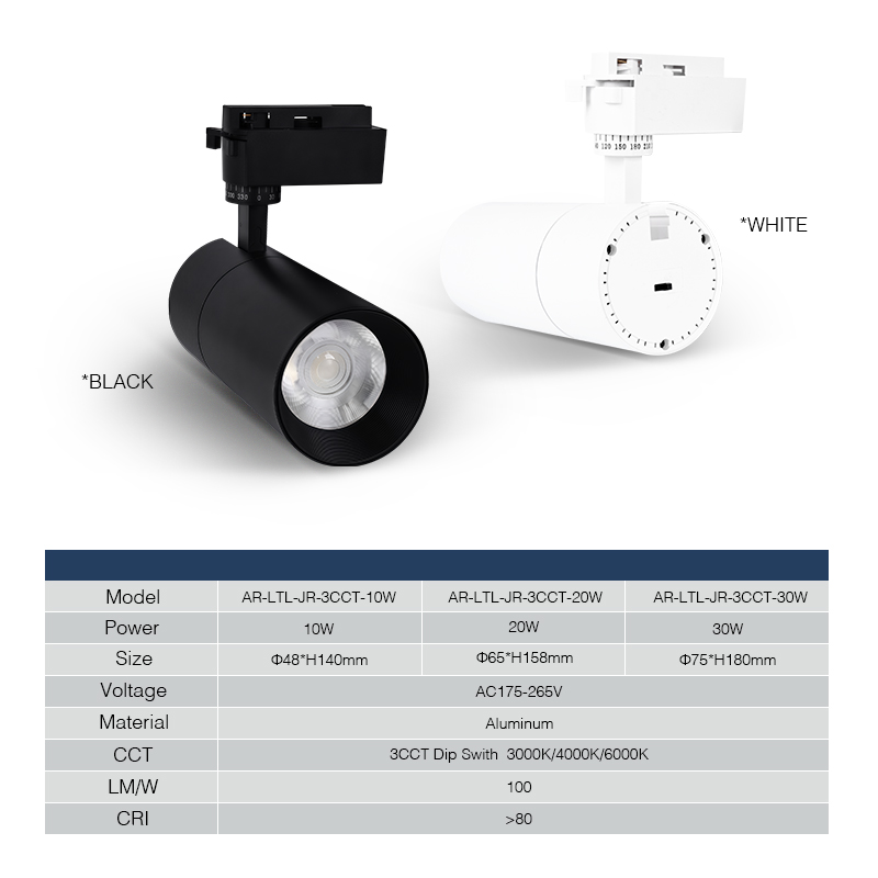 | AR-LTL-JR-3CCT-30W | 30W | Φ75*H180mm | AC175-265V | Aluminum | 3CCT Dip Swith 3000K/4000K/6000K |