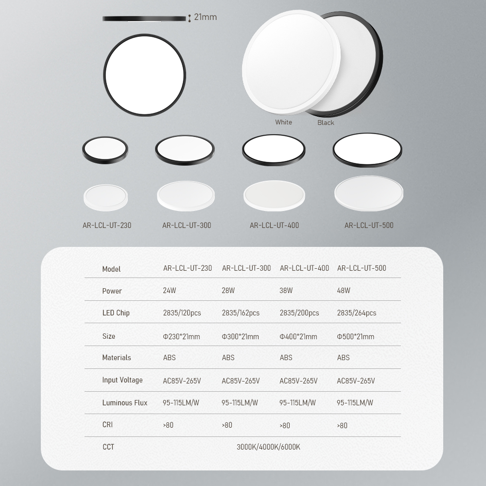 | AR-LCL-UT-230 | Φ230*21mm | 24W | SMD2835 1CCT:60pcs 3CCT:120pcs |